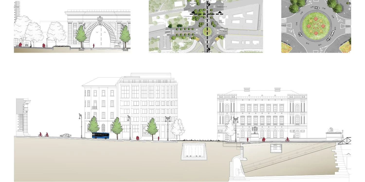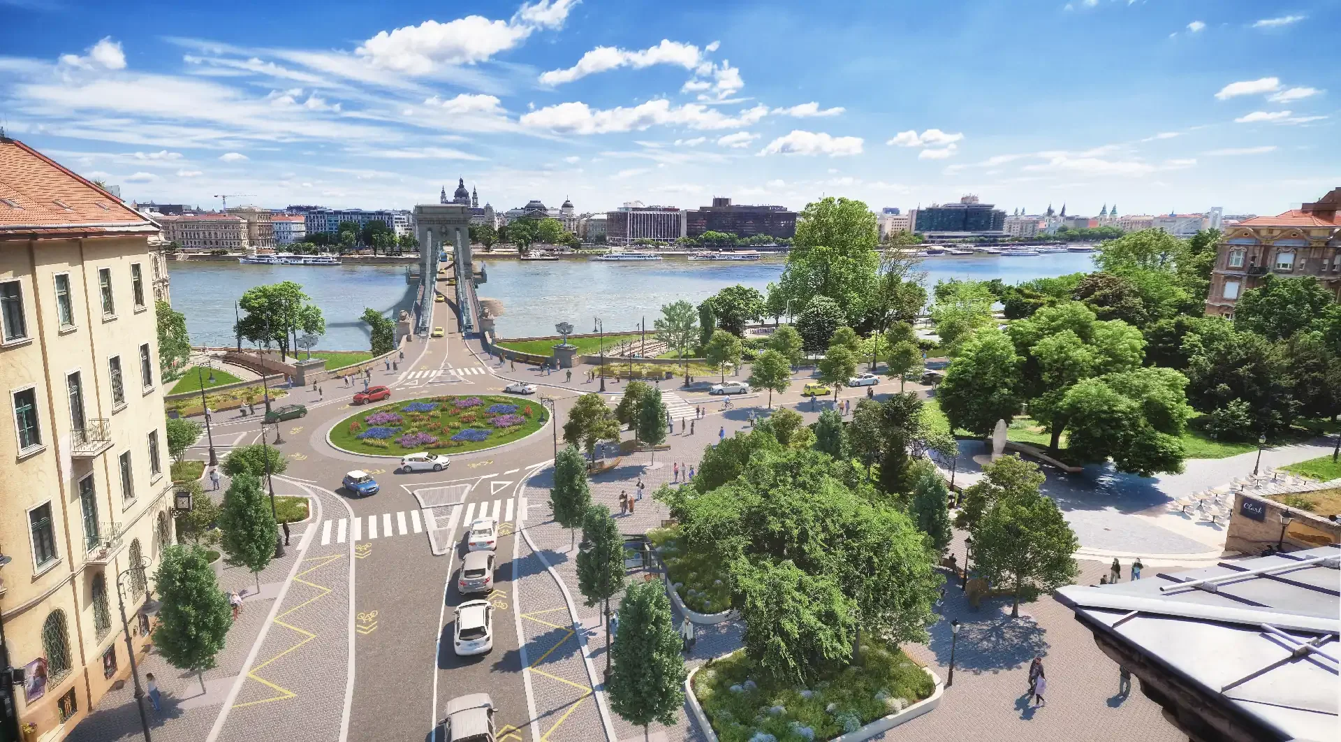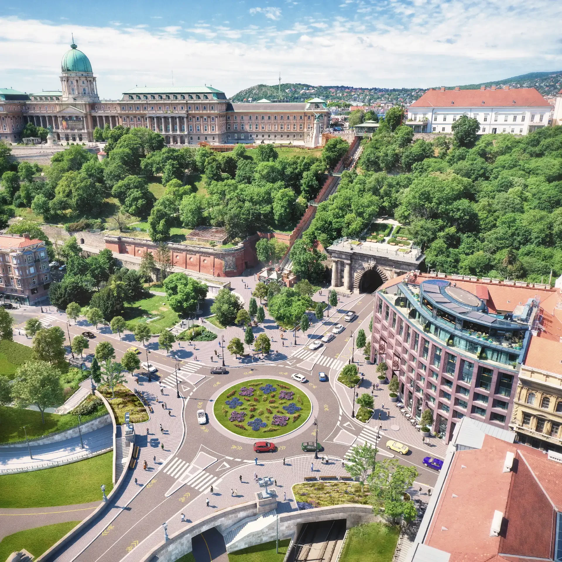 A körforgalom és közvetlen környezetének téralakítása során kiemelt hangsúlyt kapott a Lánchíd és az Alagút által meghatározott tengely mentén érvényesülő szimmetrikus térszervezés. Ezt a kompozíciós elvet erősítik a Lánchíd hídfőjénél elhelyezett kandeláberek, valamint a fásított, biodiverz növénykiültetéssel kialakított virágágyások. Az Alagút utcában a kétoldali fasor telepítése tovább fokozza a tengelyirányú hangsúlyt, miközben zöld infrastruktúraként javítja a mikroklimatikus viszonyokat és erősíti a tér egységes karakterét.