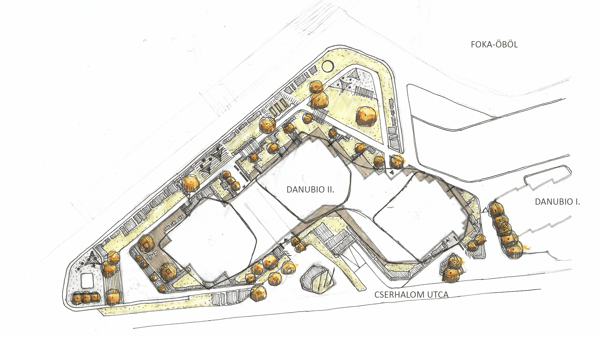A szabadterek kialakításánál alapvető szempont volt, hogy a Duna közelsége és az értékes látványirányok határozzák meg a kerti funkciók elhelyezkedését és minőségét. A gyalogos és gépjárműves feltárások praktikusak és egyértelműek legyenek, miközben a közös és privát terek világosan elkülönülnek. A zöldfelületek a lakók számára változatos és gazdag funkciókínálatot biztosítanak, a kertalakítás pedig magas színvonalú, modern elemekkel történik, ugyanakkor a meglévő stíluselemekre építve teremti meg az összhangot a környezettel.