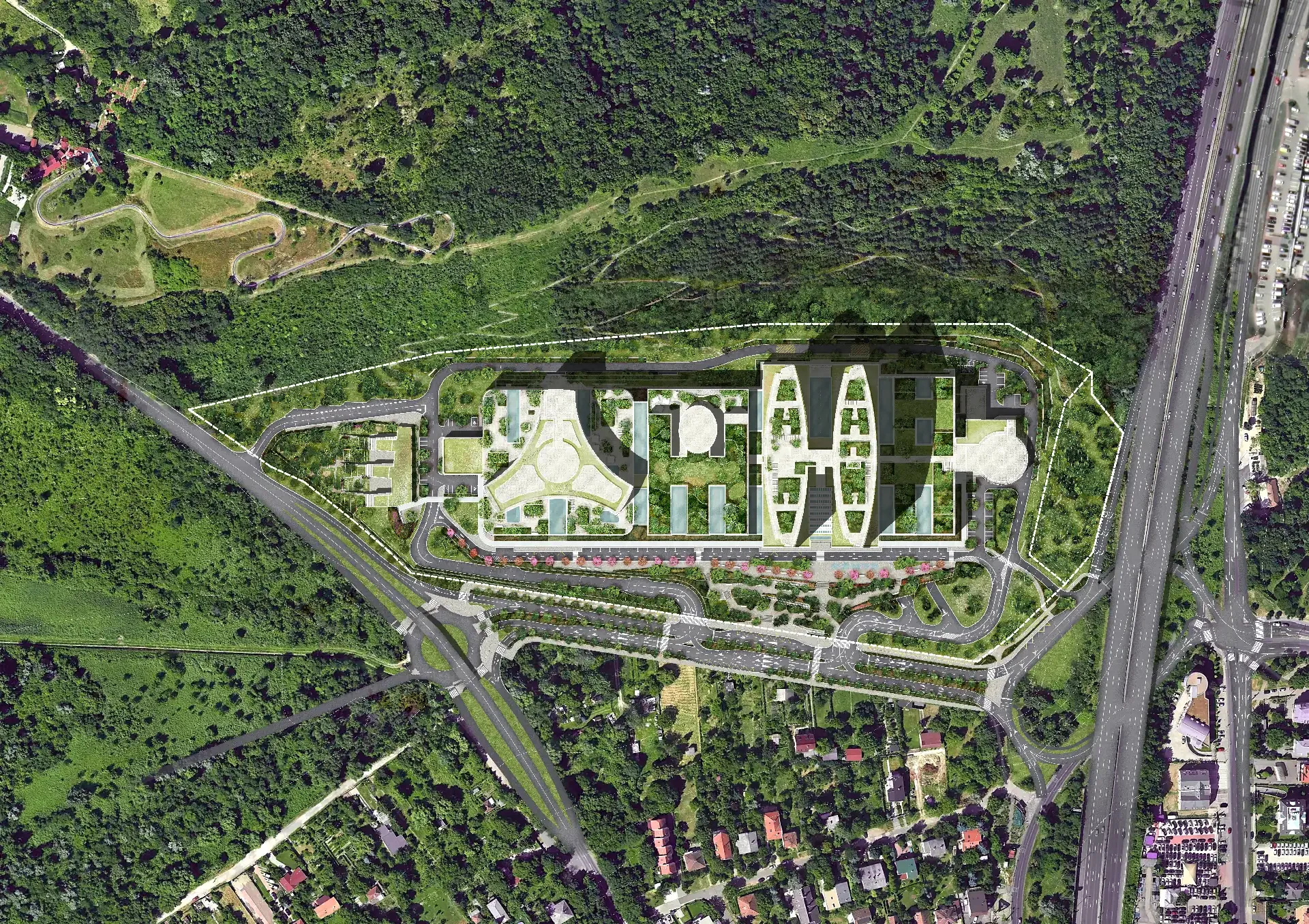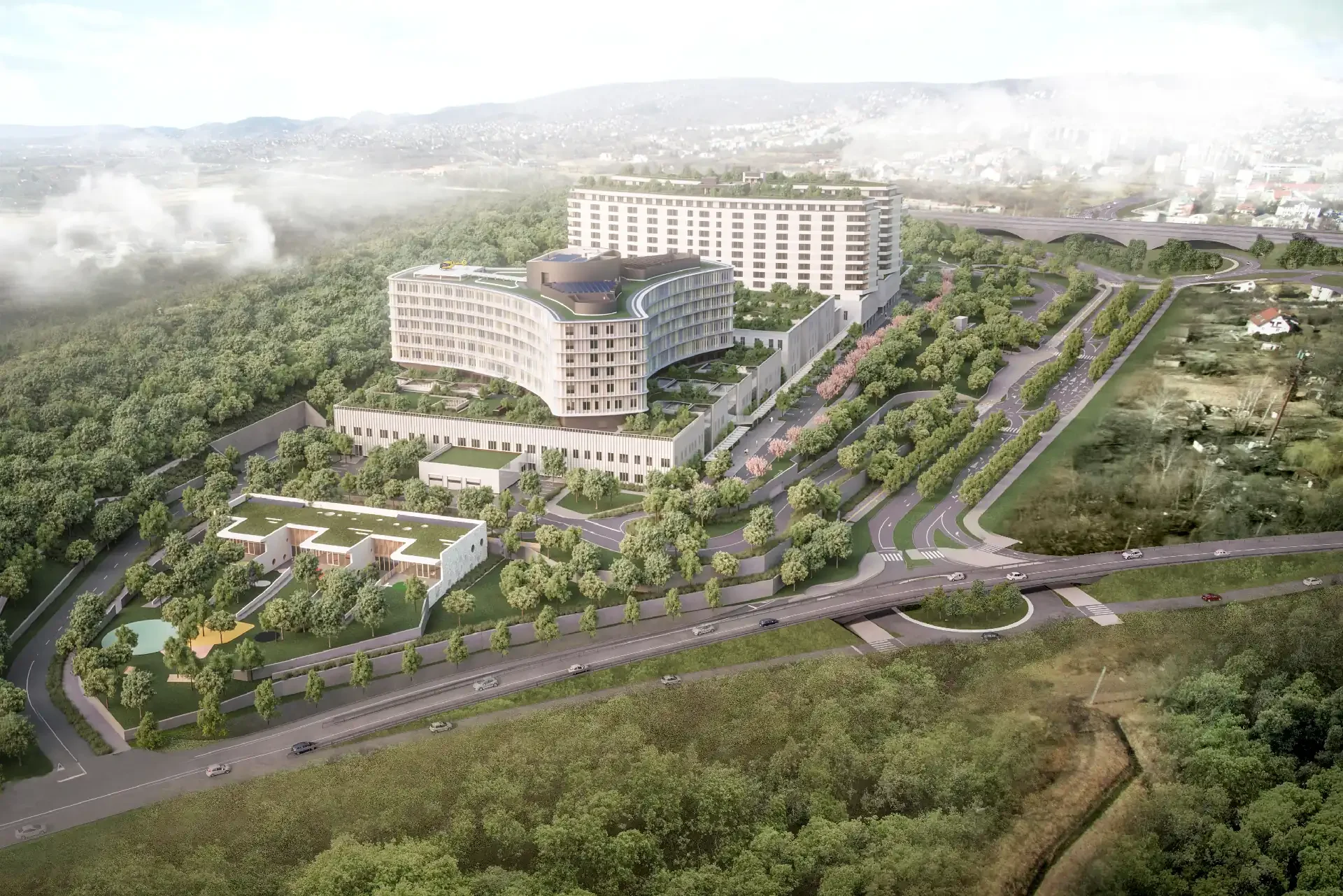 A kórház környezetének kialakítása során kiemelt szempont az autópálya és a Balatoni út forgalmi zavaró hatásainak mérséklése. Ennek érdekében a terület határain terveztett terepalakítás és erdőtelepítés zaj- és porterhelést csökkentő zöldsávként működik, miközben vizuális védelmet és mikroklimatikus előnyöket is biztosít. A beültetett vegetáció tagolt, lombos fafajokból álló erdősávként keretezi a kórház környezetét, hozzájárulva a kellemes, egészségügyi funkcióhoz illeszkedő külső tér kialakításához.