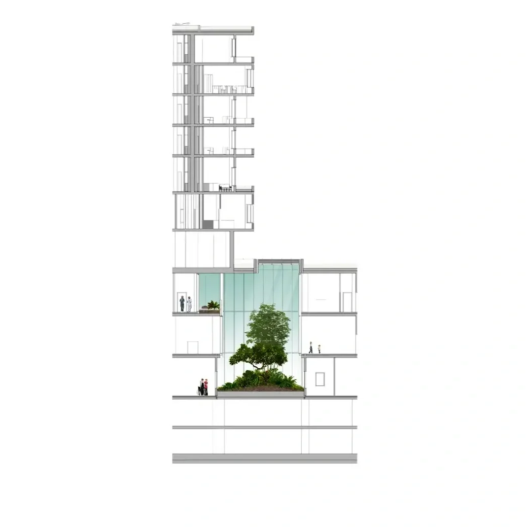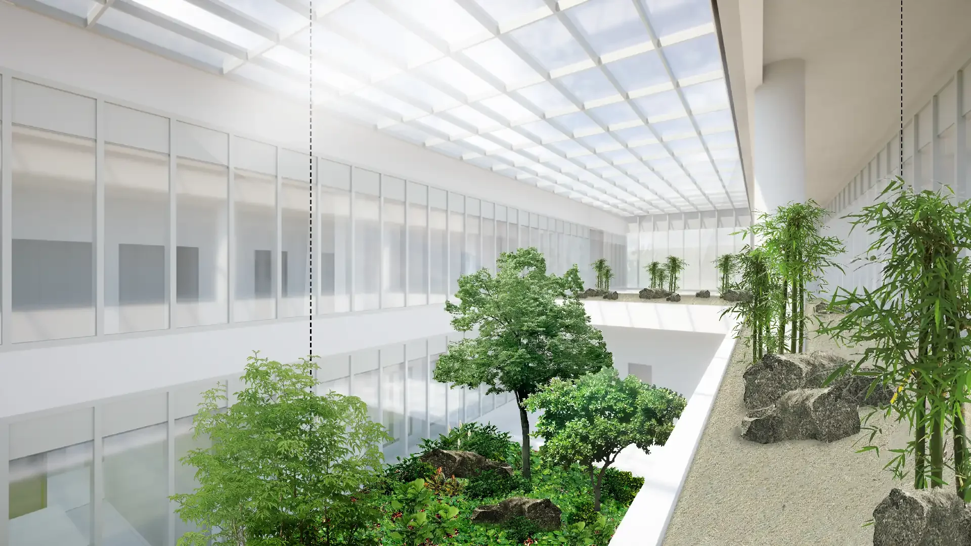 A vizsgálóhelyiségek közötti zöld átriumok kialakításával a természetes bevilágítás és benapozás jelentősen javítható, ezáltal kellemesebb és egészségesebb belső környezetet teremtve. A fedett zöld terek növényház-szerű koncepcióban valósulnak meg, lehetőséget biztosítva magasra növő, szubtrópusi növények telepítésére is.