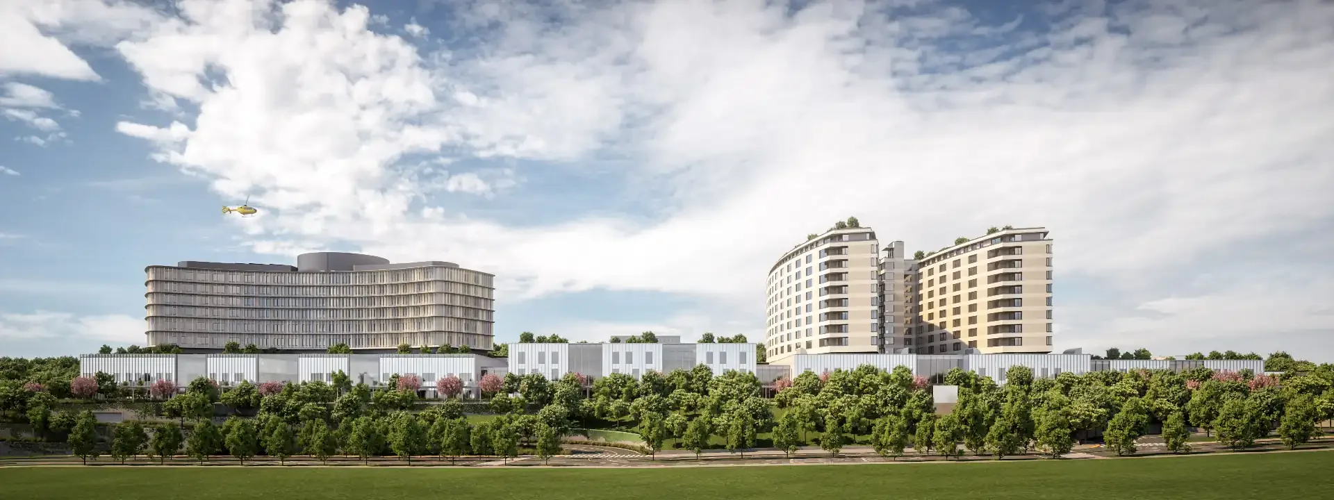 A teljes tetőfelület extenzív és intenzív tetőkertként kerül kialakításra, amely egyszerre biztosít zöldfelületi élményt és funkcionális teret. A tetőkertben kap helyet a kórházban működő óvoda és bölcsőde játszóudvara, valamint ettől szintben elválasztva egy aktív rekreációs kert, amely a pihenést, testmozgást és közösségi tevékenységeket szolgálja.