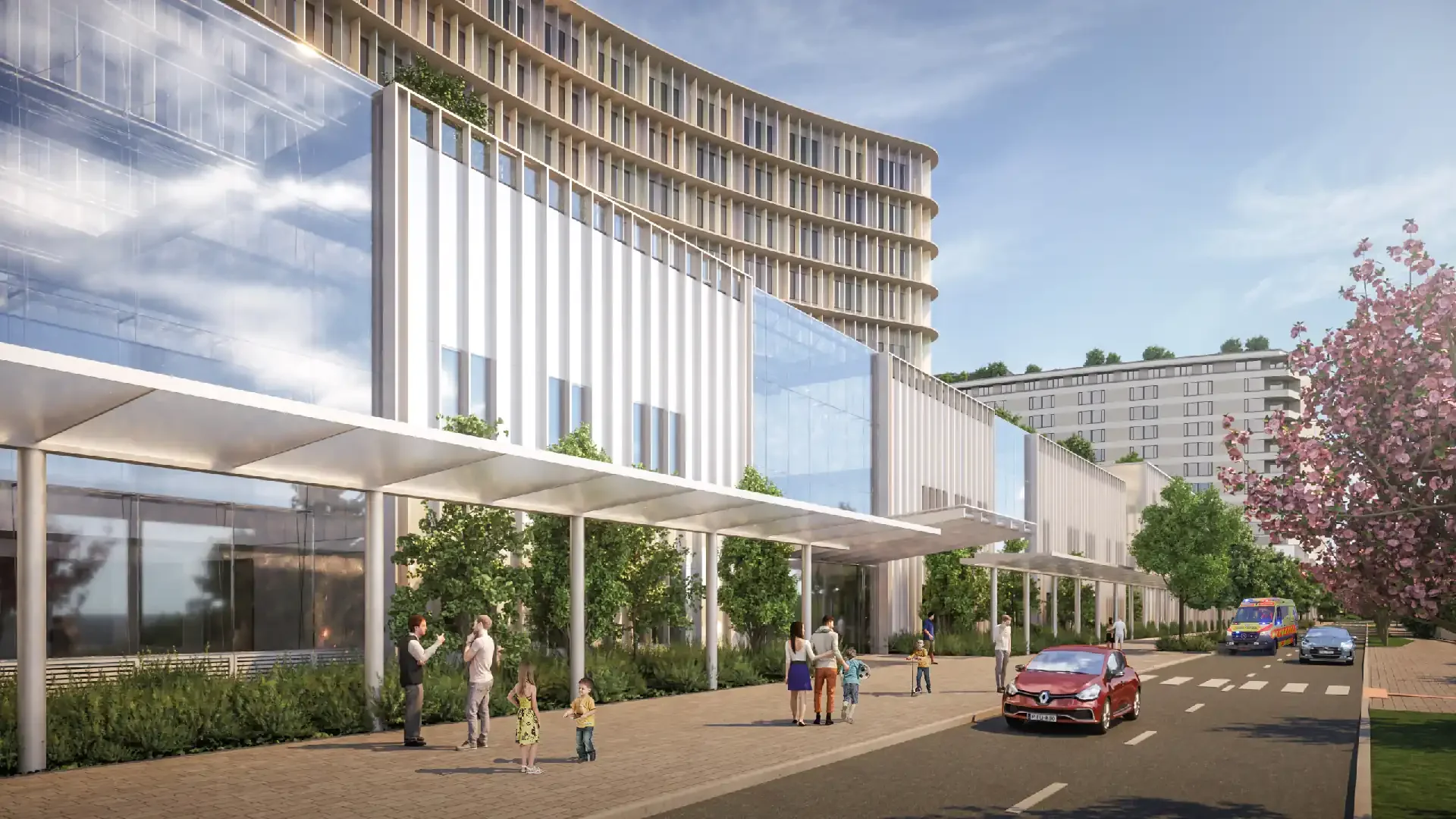 Az épületegyüttes Dobogó utcai főbejárata előtt egy reprezentatív tér kerül kialakításra, amely vízjátékkal és a nagyszámú gyalogos forgalmat, valamint a várakozókat kiszolgáló, kellően nagy kiterjedésű burkolt felületekkel biztosítja a tér funkcionális és esztétikai igényeit. A homlokzati síkot vizuálisan az intenzív virágzású díszcseresznye fasor emeli ki, erősítve az épület előtti tér karakterét.