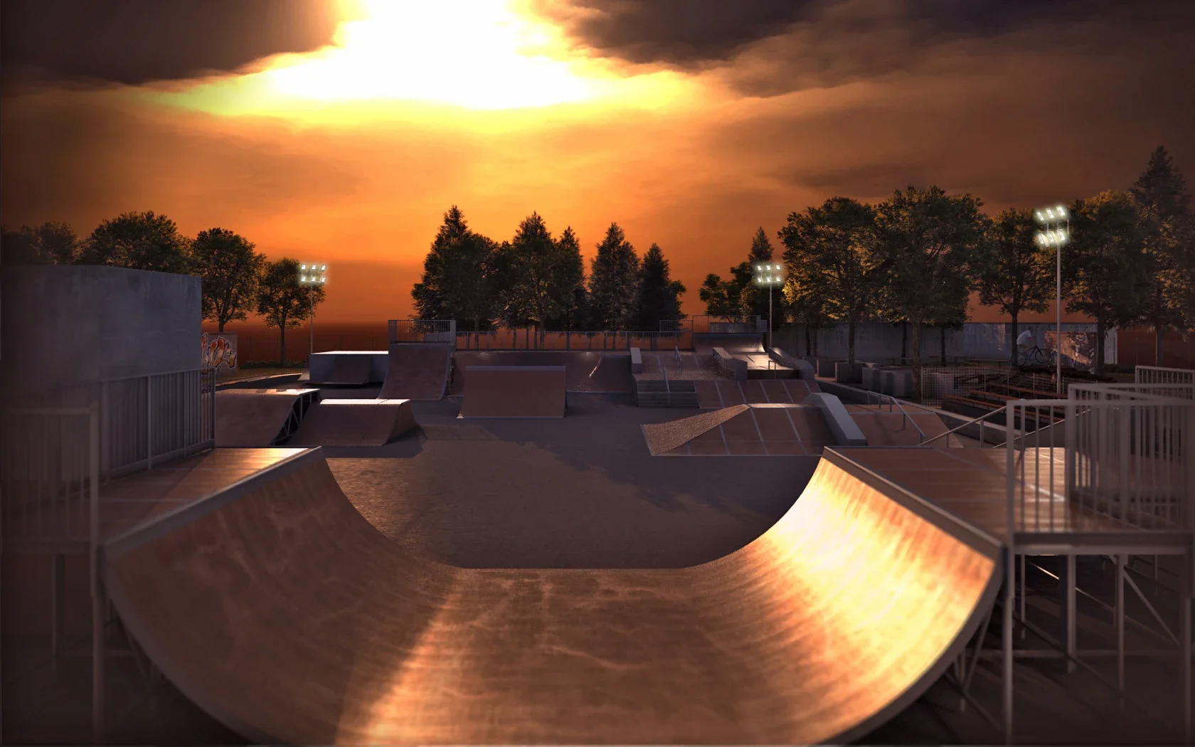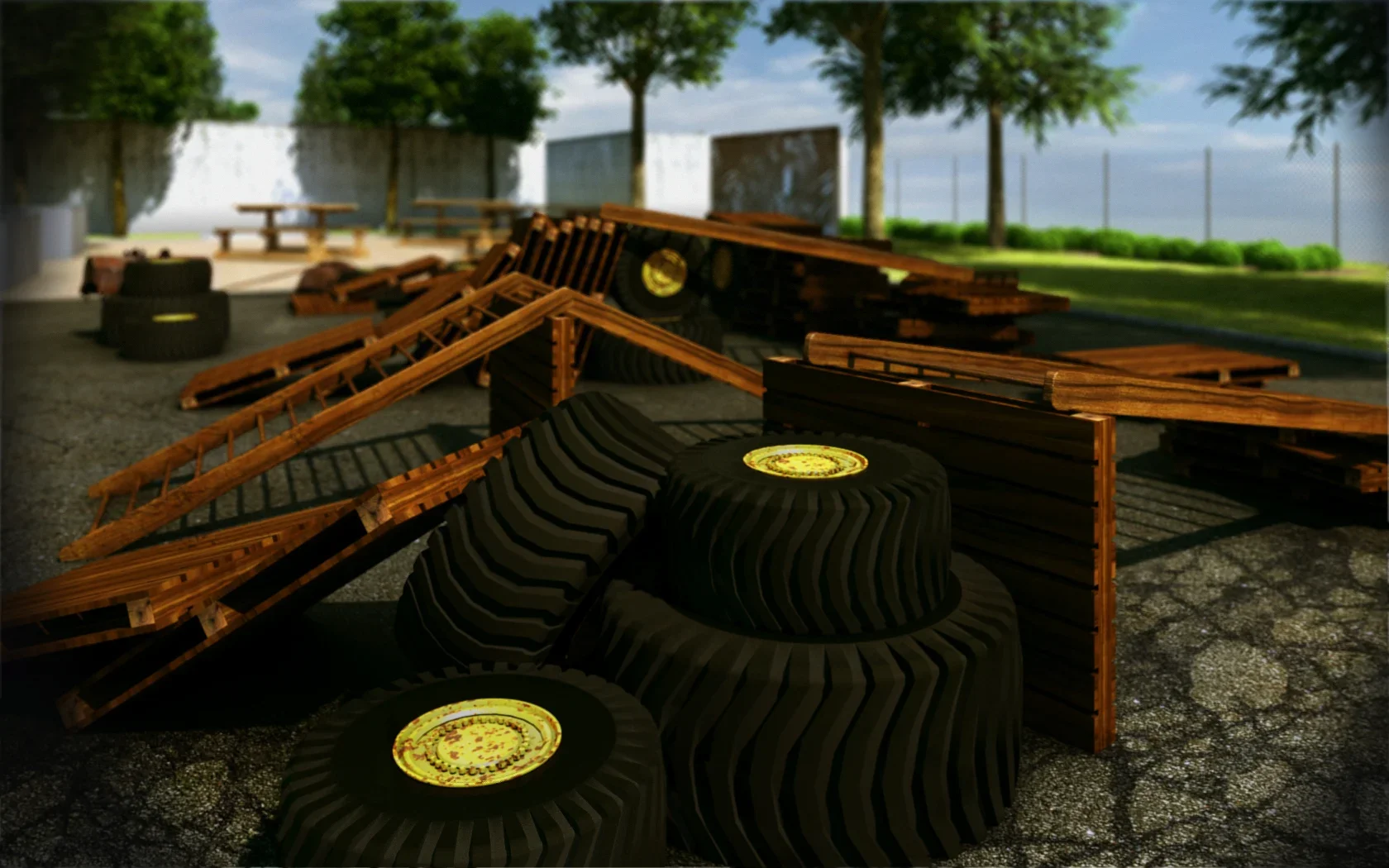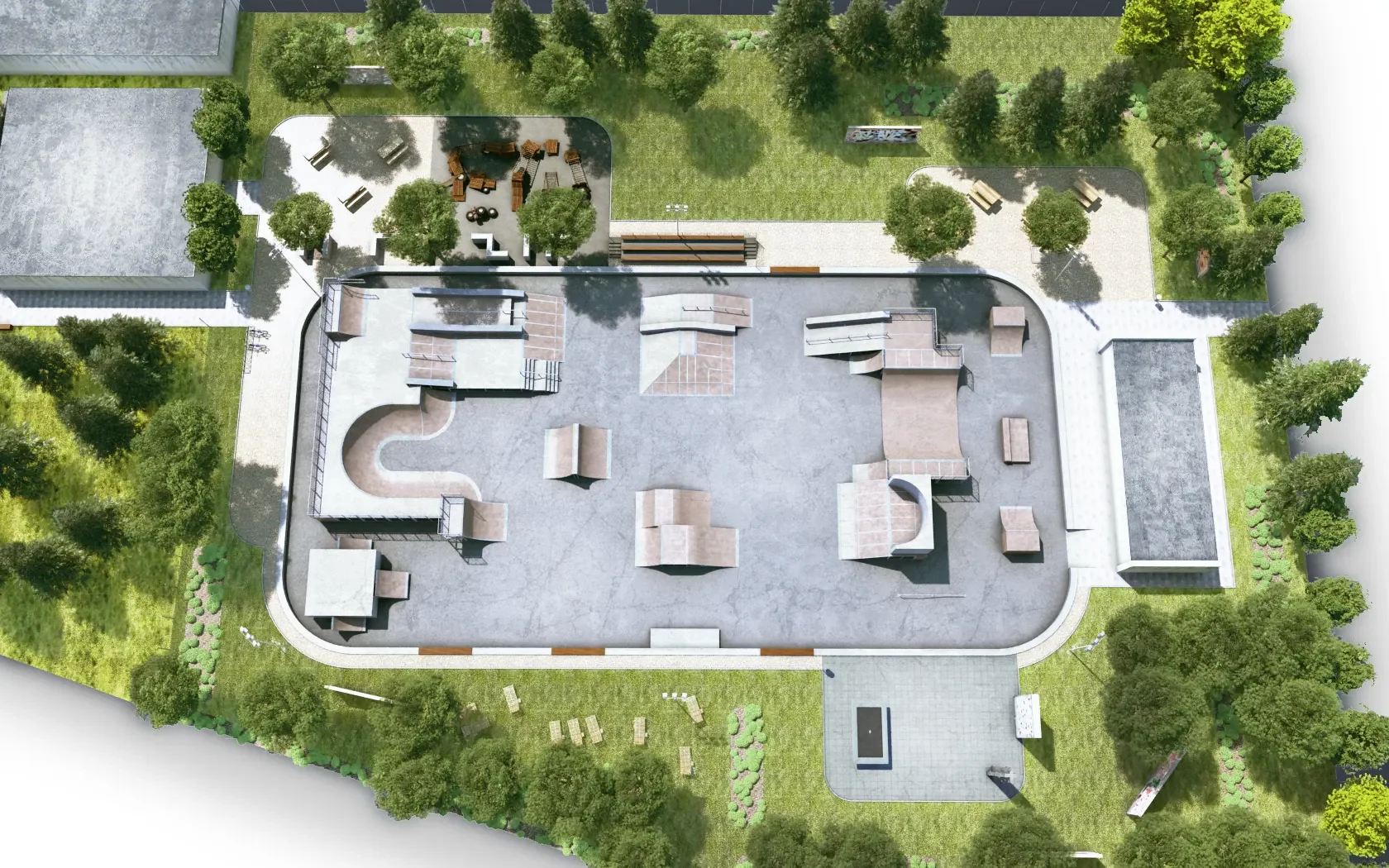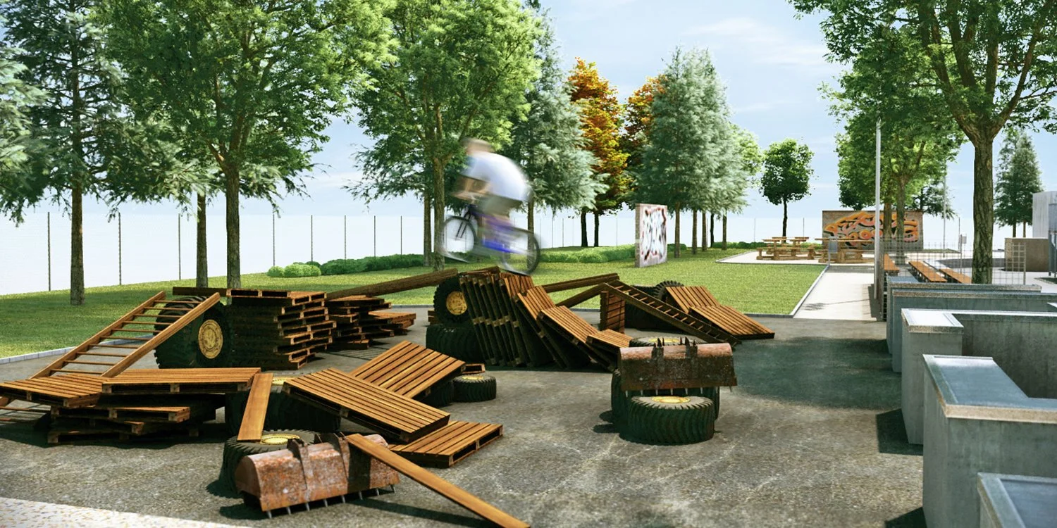 A jégpálya építménye új betonburkolatot kapott, amelyre a gördeszkapálya elemeit helyeztük el. A pálya szegélyezésére rövid szakaszokon fa ülőfelületeket terveztünk, amelyek a sportolók és a nézők kényelmét egyaránt szolgálják. A triálosok számára egy külön aszfaltozott felületet alakítottunk ki, ahol saját pályaváltozataikat építhetik, így a terület rugalmasan alkalmazkodik a különböző sporttevékenységekhez. Ezen a felületen emellett időszakos események, például koncertek vagy díjkiosztók is lebonyolíthatók, bővítve a park közösségi funkcióját.