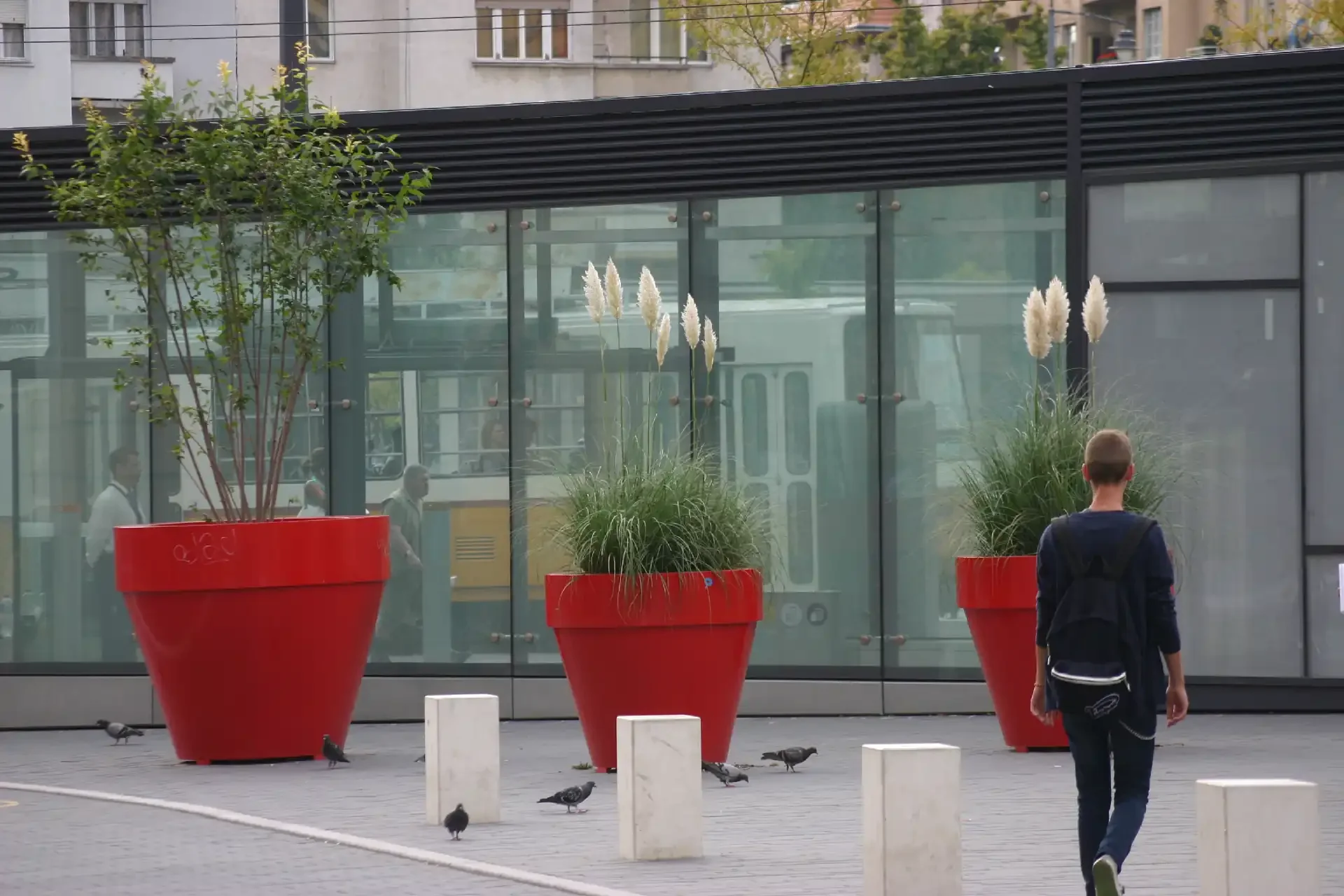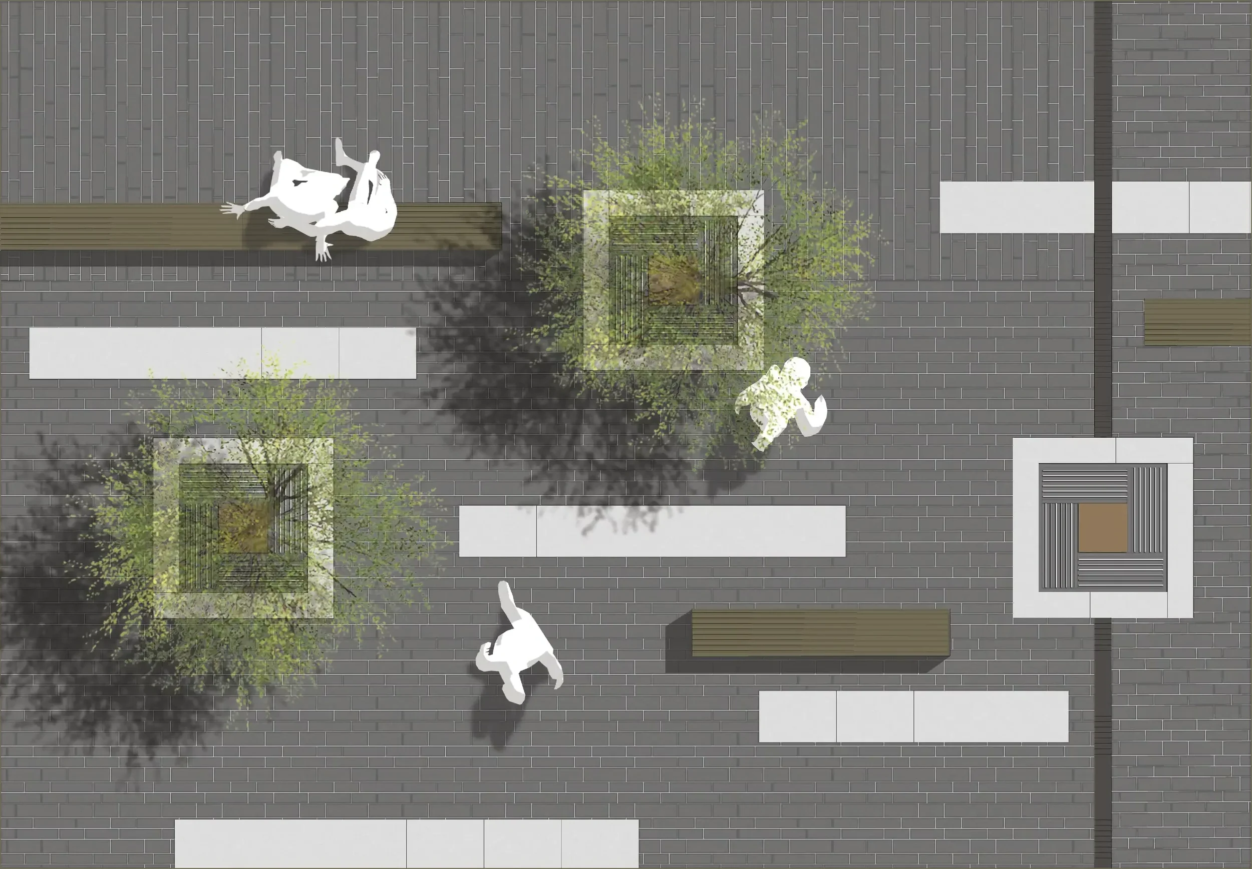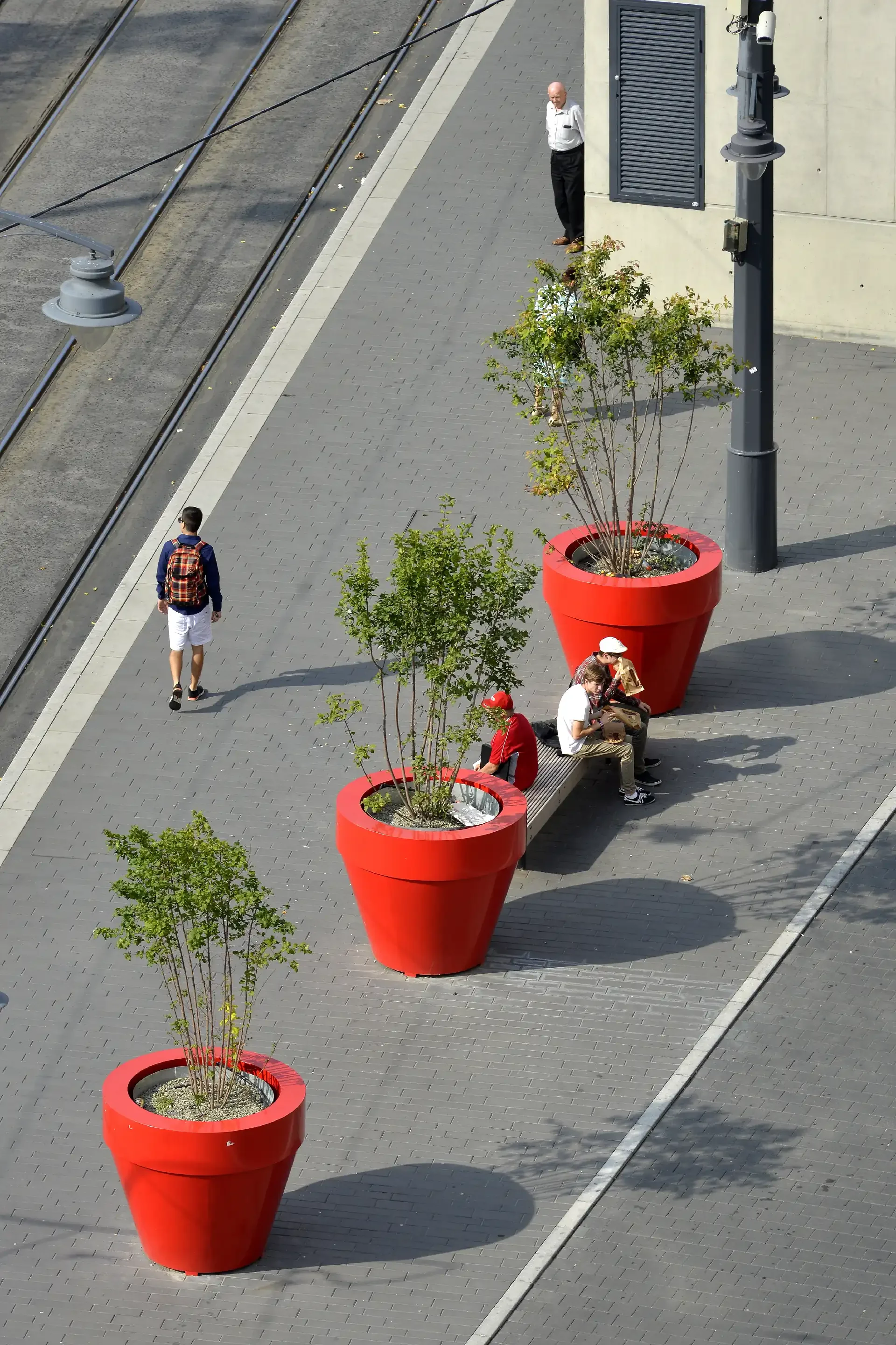 Az új formátumú, sötét színű térkő összefogja a sokszínű építészeti környezetet, funkcionalitásával átengedi a közlekedőket, alacsony reflexiós adottságával nem vakít, így befogadóvá teszi a tereket, a visszafogott burkolatarchitektúra pedig összeköti a Gomba épületét és a teret. A felszínen megjelenő piros, nagyméretű növénytartók kompozíciója élénk színfoltként jelenik meg a téren.