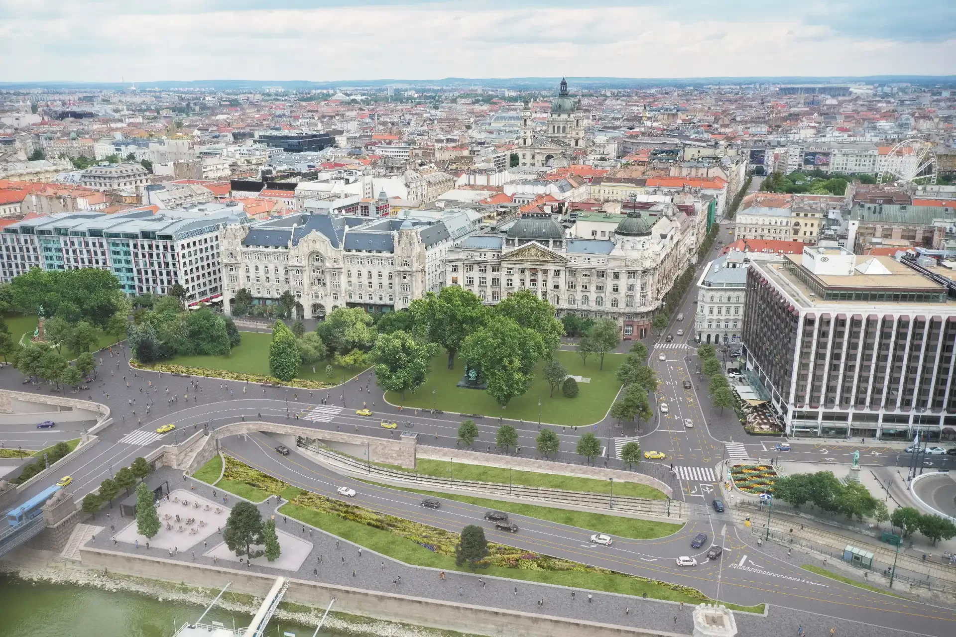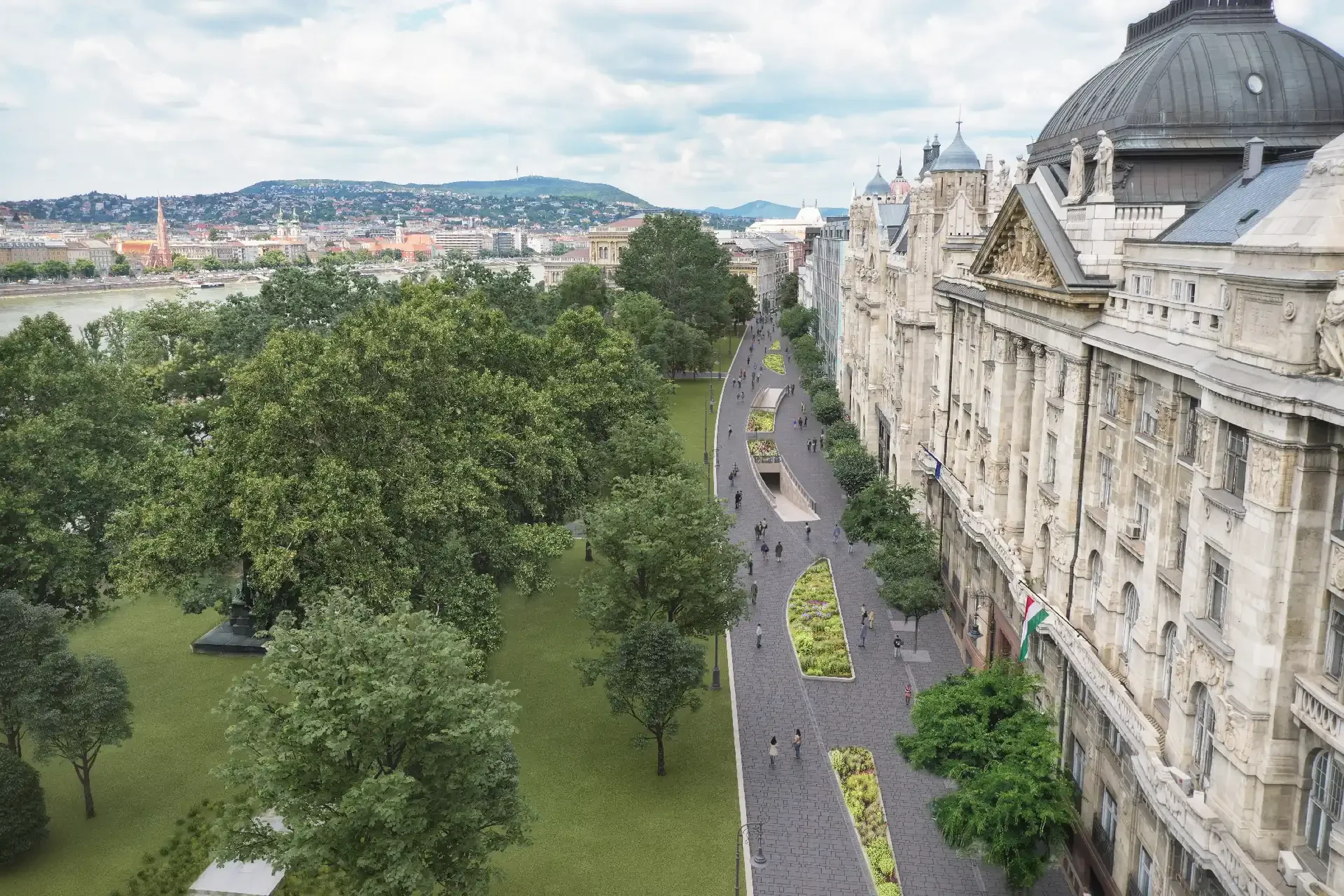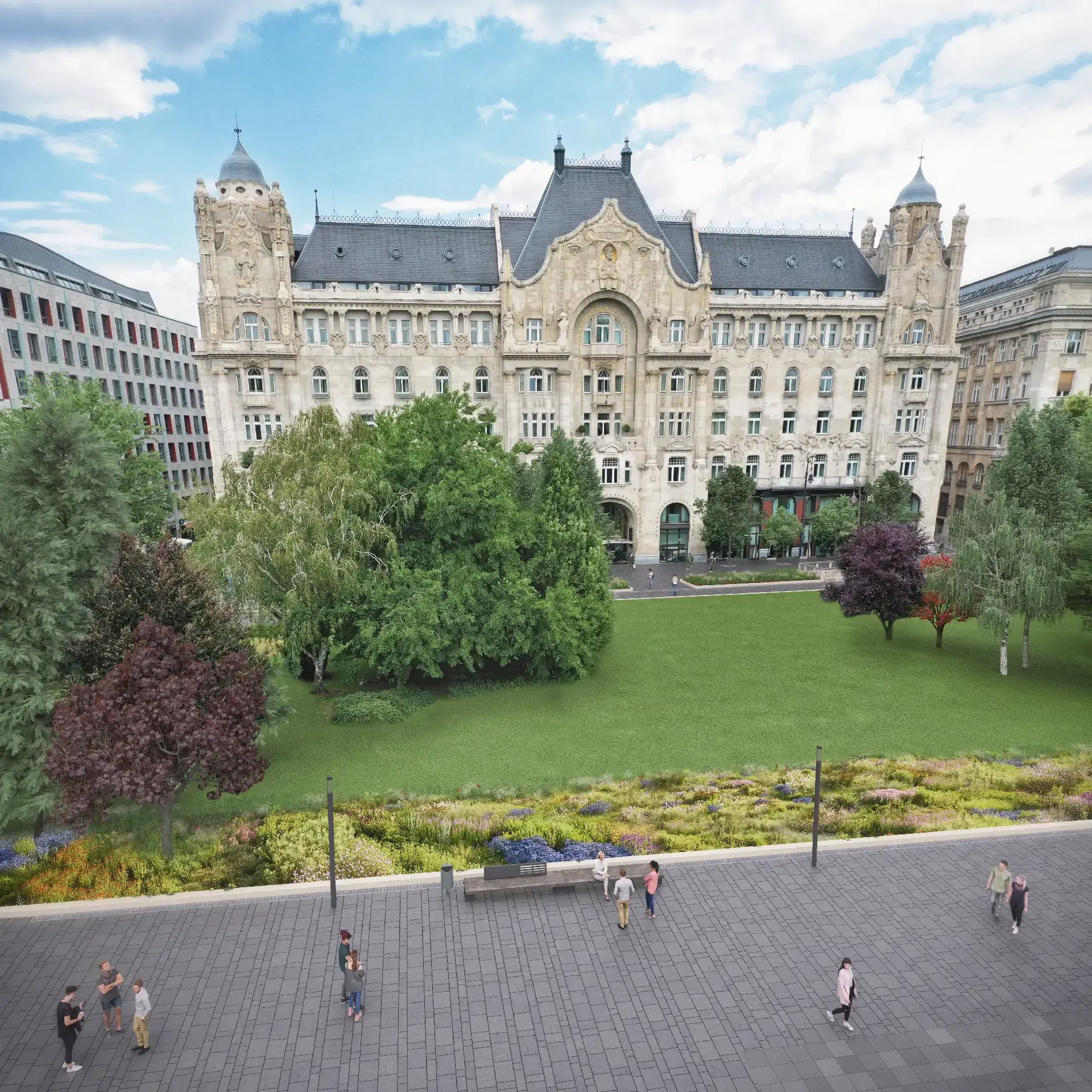 A téren a forgalmi rend átalakításának köszönhetően jelentősen megnő a gyalogos felületek aránya, amelyek színvonalas utcabútorokkal és bőséges fásítással egészülnek ki. Ezek a felületek nem csupán a gyalogos áthaladást teszik kényelmesebbé, hanem kellemes tartózkodóhelyekként is szolgálnak. A tér két fő szervező műalkotása – Gróf Széchenyi István és Deák Ferenc szobra – változatlan helyén marad a gyepfelületek között, így biztosítva a történeti karakter megőrzését. A korábbi gépjármű-közlekedési peremterületeken fasorok és facsoportok telepítésével, valamint a meglévő gyepfelületek díszes virágágyakkal történő kiegészítésével gazdagítottuk a zöld struktúrát. A burkolt felületeken a fák nagyméretű, speciális ültetőgödrökbe kerülnek, amelyekben a gyalogos felületekre hulló csapadékvíz is bevezetésre kerül, ezáltal a tér fenntarthatósága és ökológiai értéke is növekszik.