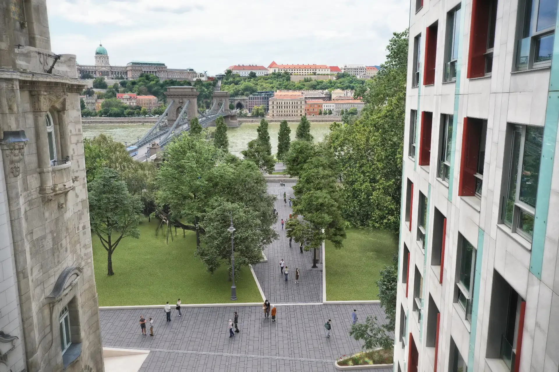 A Széchenyi István tér átformálása a történeti térképek elemzése alapján történt: az 1908 körüli három zöldfelületi folt megjelenik az új térrendszerben, miközben a Zrínyi és a Mérleg utca tengelye átvezetésre kerül a Széchenyi Lánchíd irányába. A tér kialakítása a határoló öt jelentős épülettömb ritmusát követi: az Akadémia előtt egy nagyobb burkolt felület jön létre, míg a Roosevelt irodaház, a Gresham palota és a Belügyminisztérium előtt kisebb, zöldfelületi foltok kerülnek kialakításra. A Lánchíd előtt szintén burkolt terület alakul ki, amely hosszú ülőfelülettel zárul, és a gyalogos tartózkodást is szolgálja. A Széchenyi Lánchíd felé vezető közlekedési útvonal által generált aszimmetriát a híd északi oldalán, a Zrínyi utca tengelyében elhelyezett vízjáték ellensúlyozza. A fő tervezési irányelveket a 2015-ös, I. helyezést elért pályaművünk rögzítette, és a jelenlegi diszpozícióban a pályázati változathoz képest a zöldfelületek jelentős növelését sikerült elérni, erősítve a tér vizuális és funkcionális értékét.