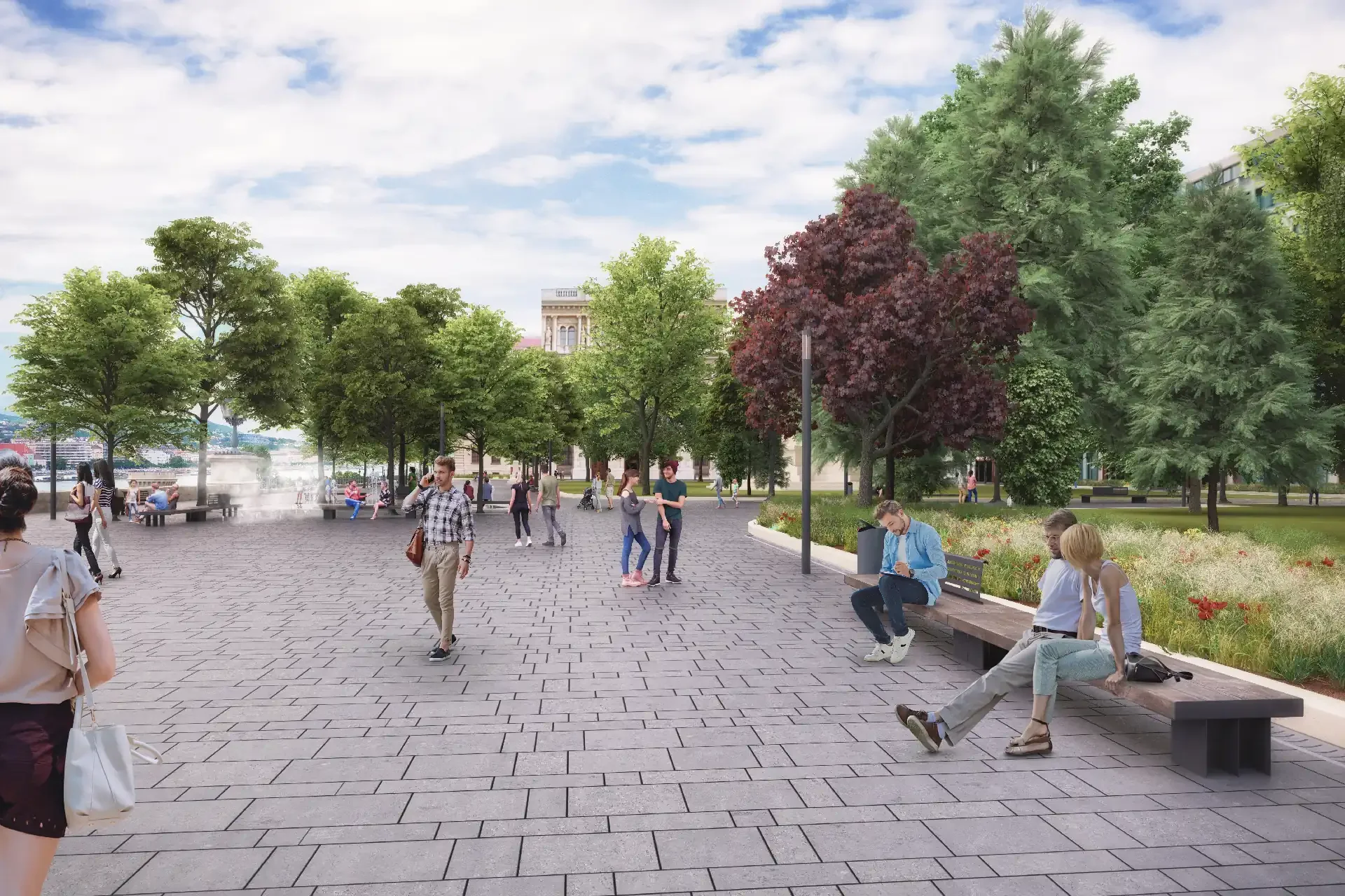 A Széchenyi tér áttervezésekor alapvető cél volt, hogy a történelmi örökség és a meglévő, értékes zöldfelületi, kultúrtörténeti és építészeti adottságok megtartásával, a jelenlegi közlekedési struktúra átrendezésével egy új, egységes arculatú, emblematikus köztér jöjjön létre. Az új köztéri struktúrában a zöldfelületek továbbra is meghatározó szerepet kapnak, miközben a gyalogos átközlekedés és tartózkodás lehetősége új, magas színvonalú minőségi élményt kínál, erősítve a tér vizuális kohézióját és a közösségi funkciók befogadását.