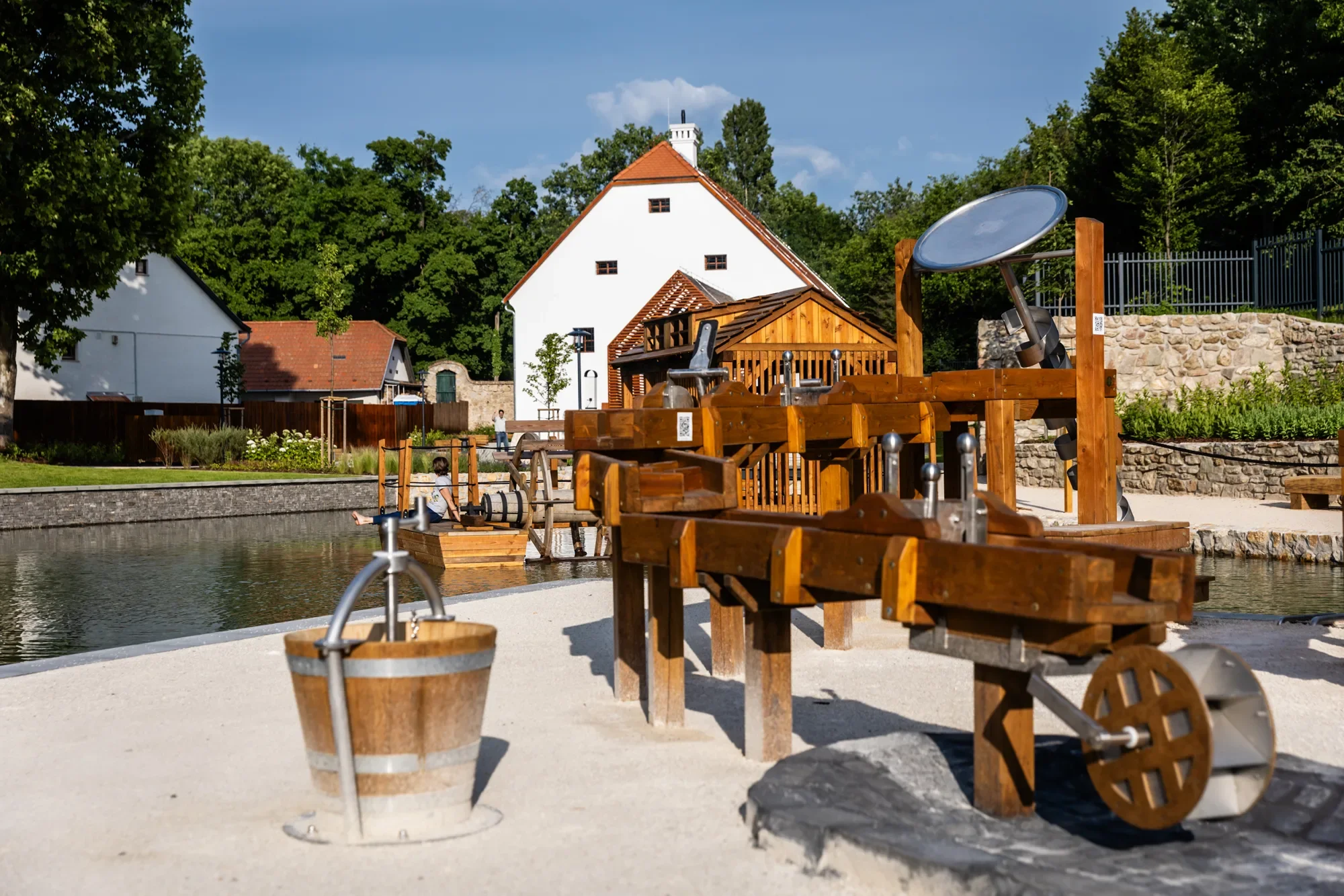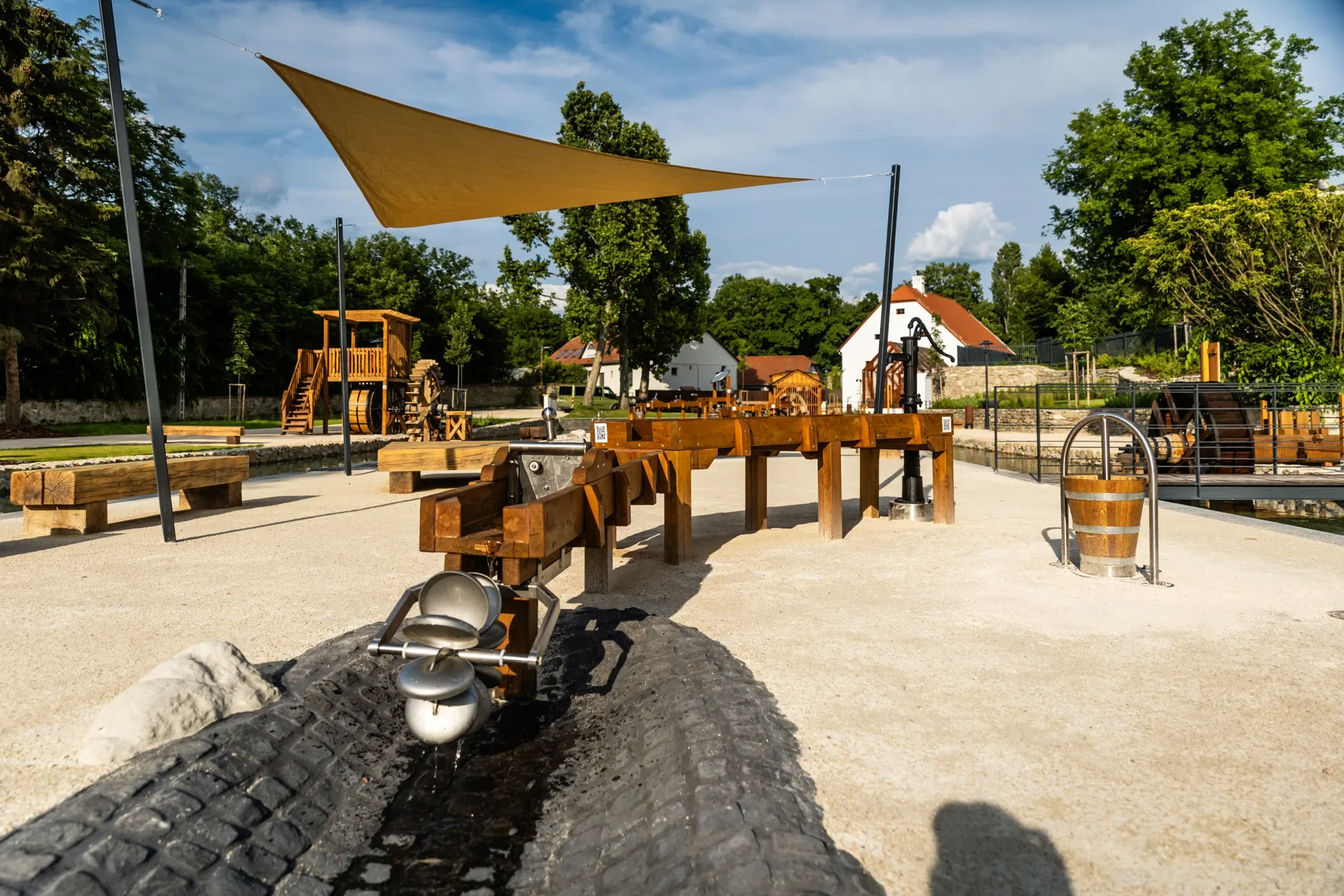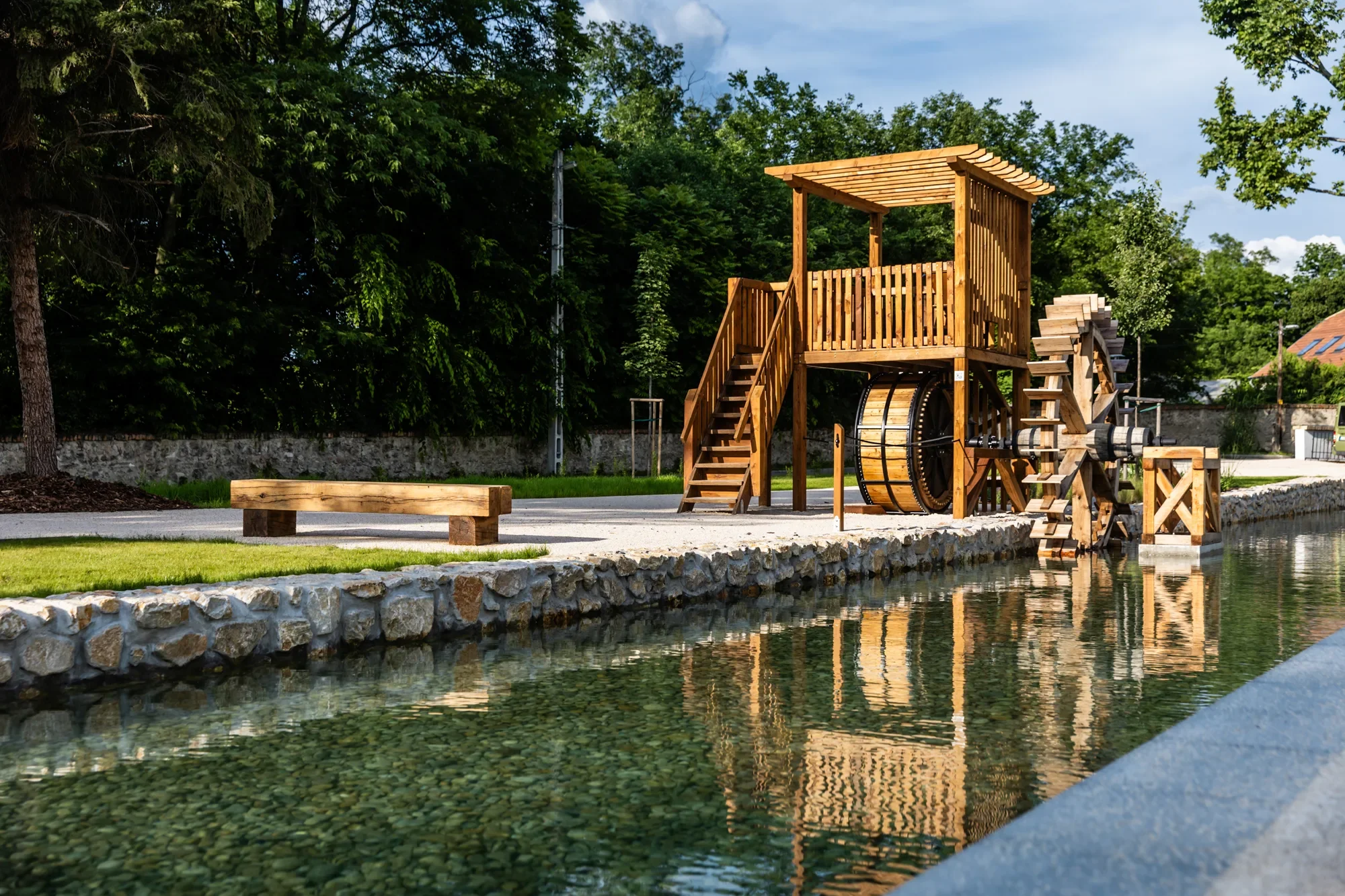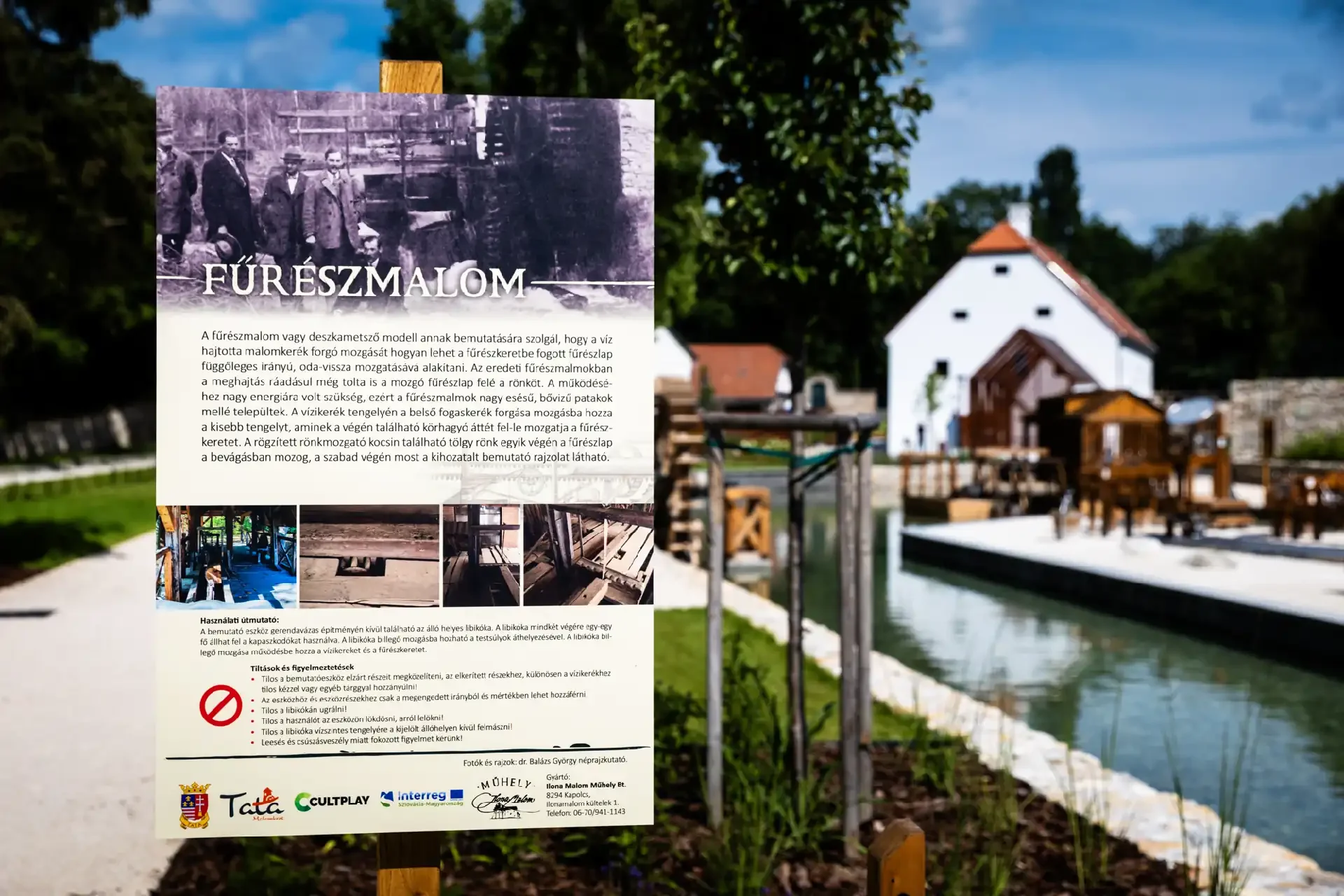A Malom-árok külső pereme mentén kisméretű, arányhelyes malommodellek kerülnek elhelyezésre. Ezek a városban egykor működő malomtípusok – lisztőrlő, kalló-, valamint fűrészmalom – hiteles, jól körbejárható leképezései, amelyek a gyermekek számára játékos módon teszik megismerhetővé a történeti ipari technológiákat. A szerkezetek szabadon működtethetők, kialakításuk szándékoltan sematikus, a tervezés során alapvető szempont volt a biztonságos használhatóság. A Malom-árok egyik hangsúlyos elemeként, a térségi összefogás és kulturális identitás erősítésének jegyében, az SKHU pályázat keretében a gútai vízimalom bemutatása is megvalósul.