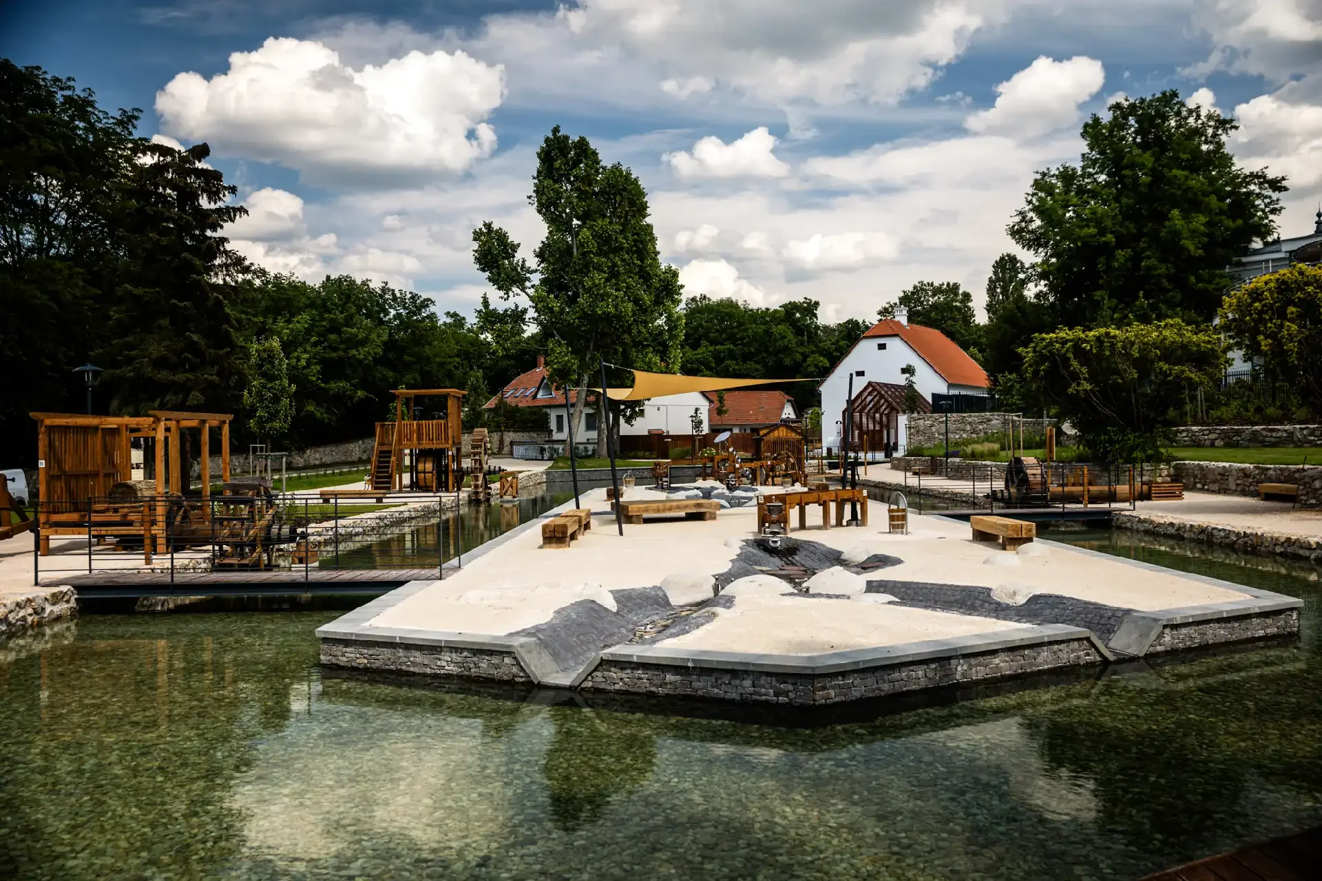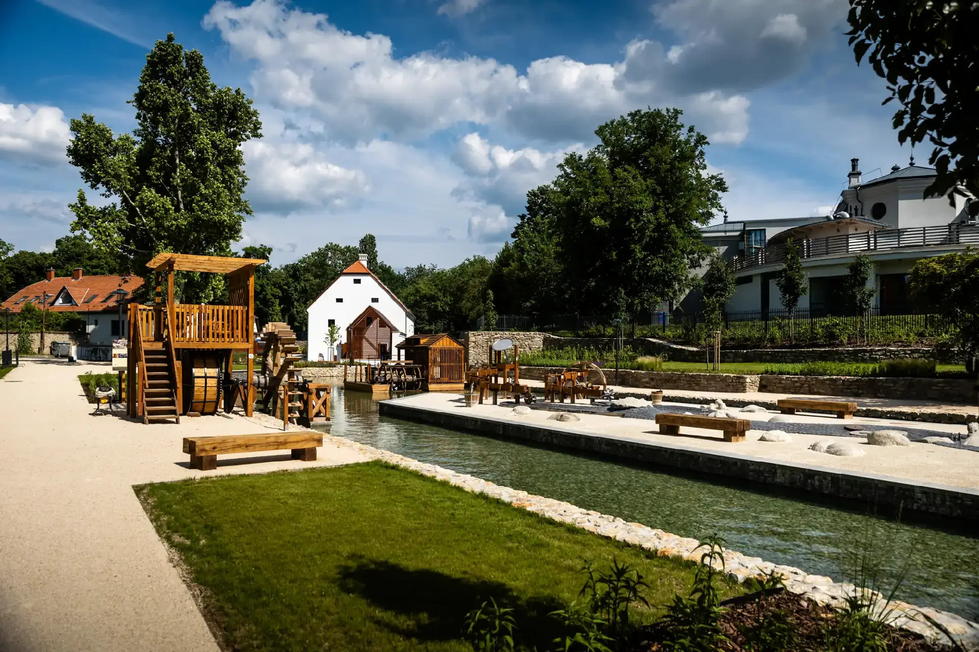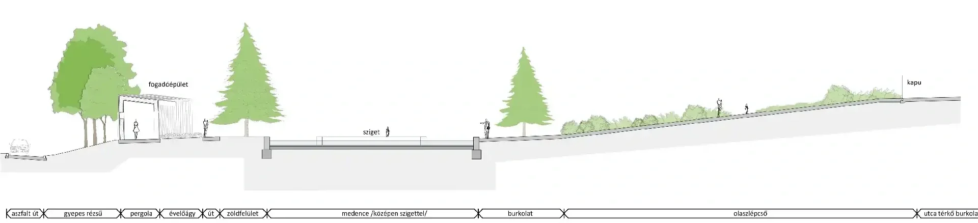 A terület legfontosabb térszervező és identitáshordozó eleme a Malom-árok vonalvezetése, amelyet az eredeti nyomvonal mentén jelenítünk meg. A jelenlegi tulajdonviszonyok, vízszintek és befogadói adottságok nem teszik lehetővé az árok teljes hosszában történő rekonstrukcióját, azonban annak kontúrját burkolati rajzolatokkal és zöldfelületi elemekkel következetesen jelezzük. Tekintettel arra, hogy a terület elsődleges használói gyermekek, a vízfelület csökkentett, legfeljebb 0,60 m mélységű mederkialakítással valósul meg. Az árok oldalfalai terméskő burkolattal készülnek, a vízzárást korszerű fóliarendszer biztosítja, míg a meder aljzata kulé szórással kerül kialakításra, illeszkedve a korábbi parkrehabilitáció során alkalmazott anyaghasználathoz.