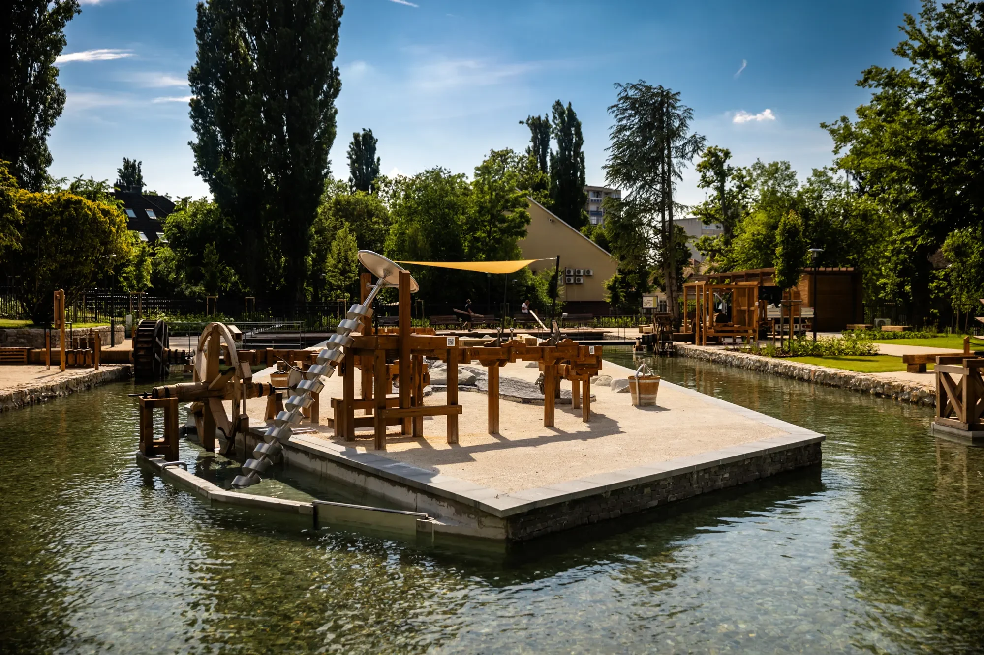 A Malom-árokban kialakított új szigeten kapnak helyet a különböző vízimalom-meghajtási módokat – alulcsapott, derékban csapott, felülcsapott, kanalas malom stb. – bemutató installációk. A sziget a mintegy 17 méter széles Malom-árok középvonalában helyezkedik el, formavilága utal a történeti vízimalmoknál alkalmazott, vízkormányzást és keréktartást segítő szigetekre. A gyermekek aktív részvételével működtethető rendszer lehetővé teszi a víz kézi átemelését a Malom-árokból egy kisebb patakágba, ahol a víz rekeszelése és irányítása révén a szerteágazó patakhálózat különböző malommeghajtó szerkezetei hozhatók működésbe. A szigetet és a túlpartot több gyalogos híd kapcsolja össze, biztosítva a körbejárhatóságot és a folyamatos térélményt.